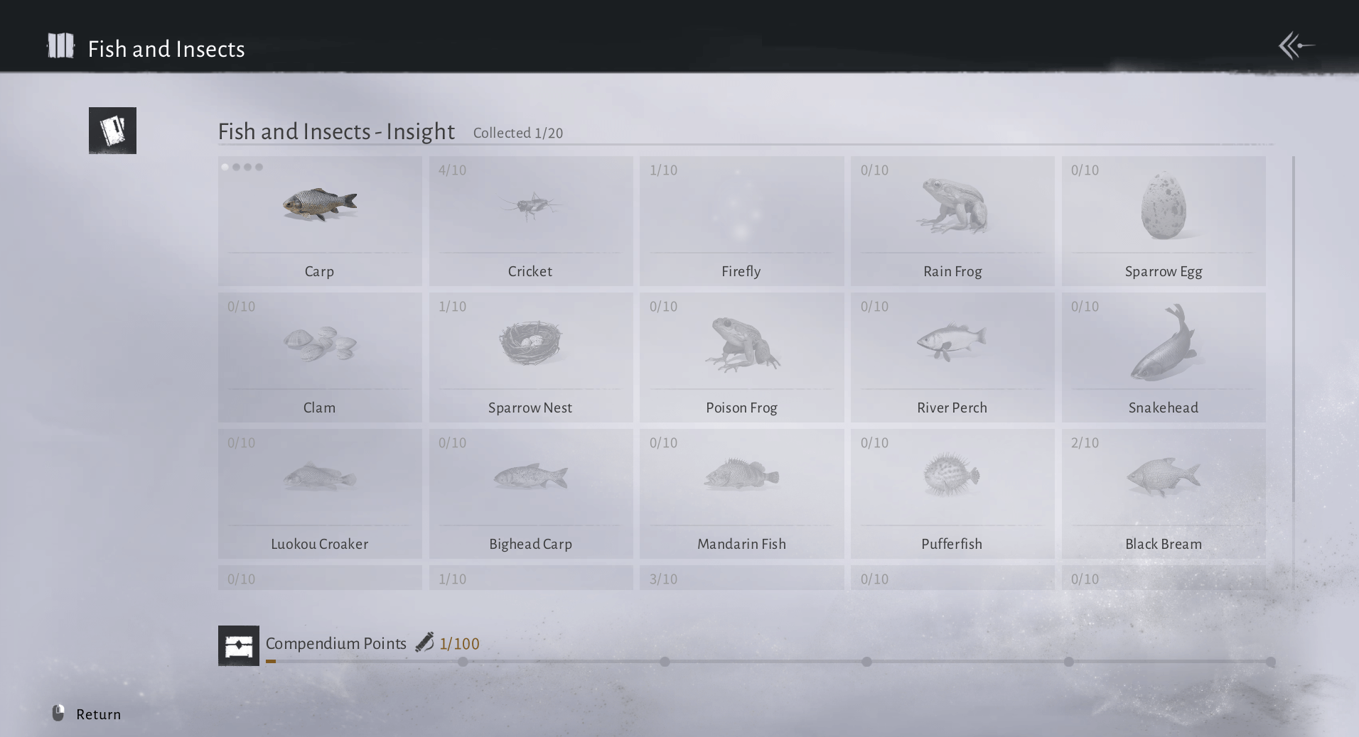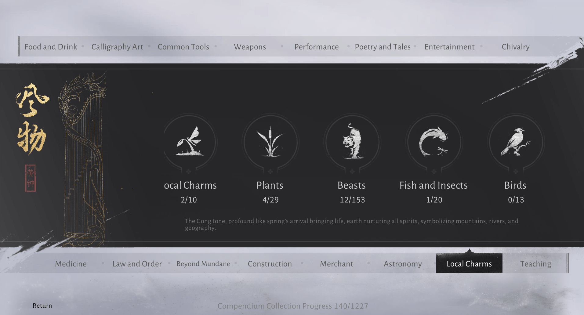Go to your menu and open the Compendium tab underneath the Story section. Once you're in the Compendium, tab all the way over to the Local Charms section at the bottom. From there, tab over to Fish and Insects.