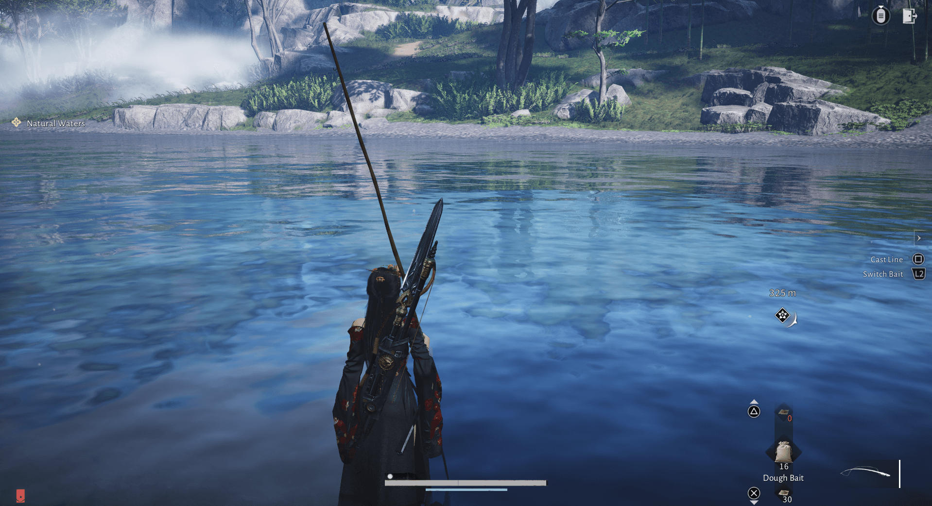 Once you start fishing, select which bait you want to use. Press L2, then press X or the Triangle button to cycle through your available bait options. Leave it on whichever bait you decide to use.
