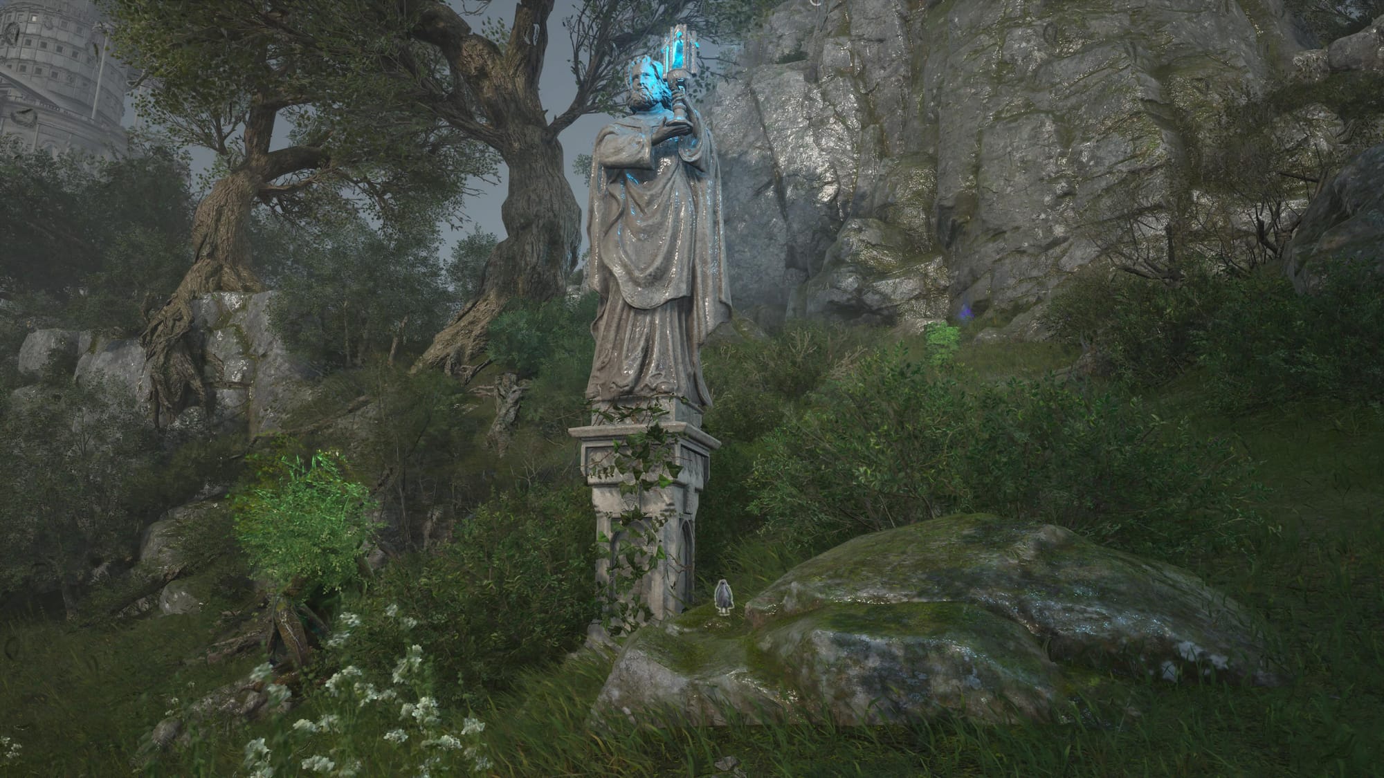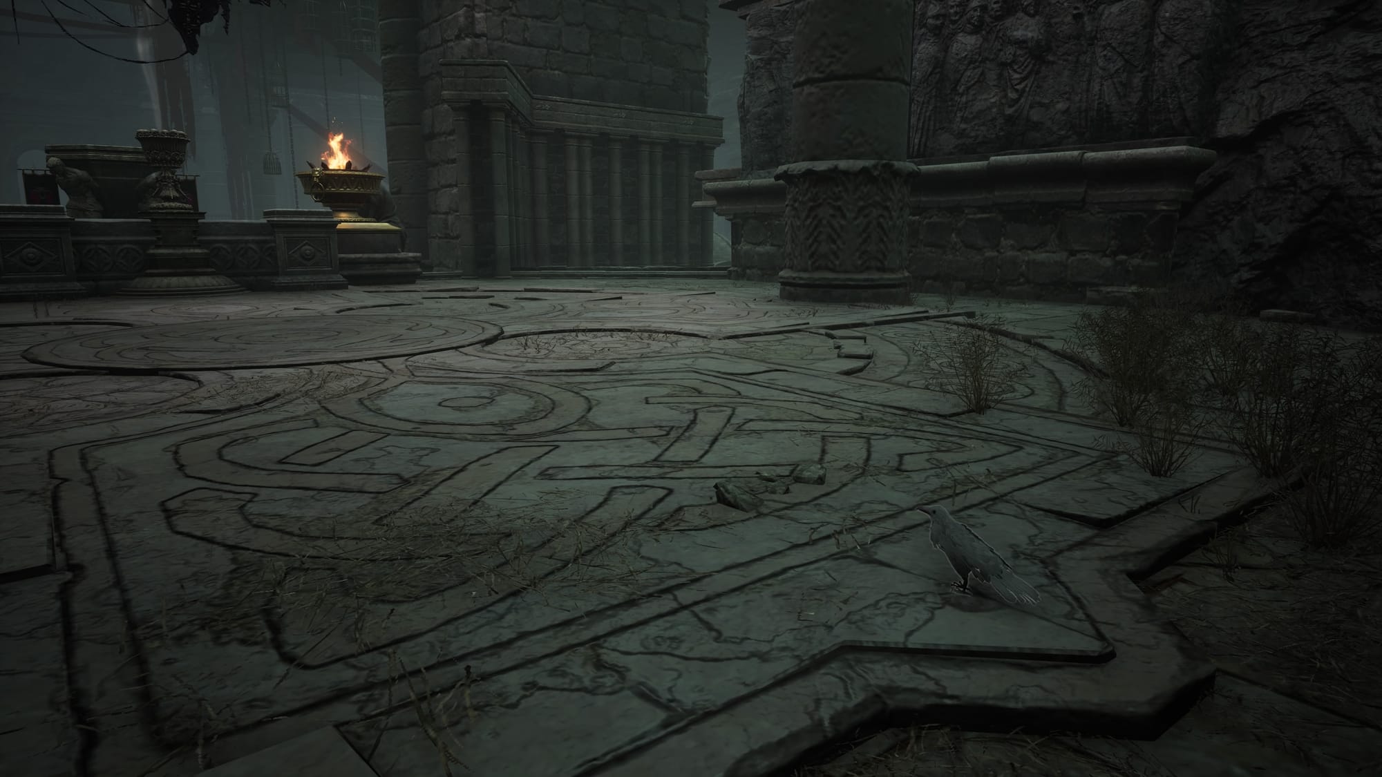 The crow is by a statue holding a torch that emits a blue light.
