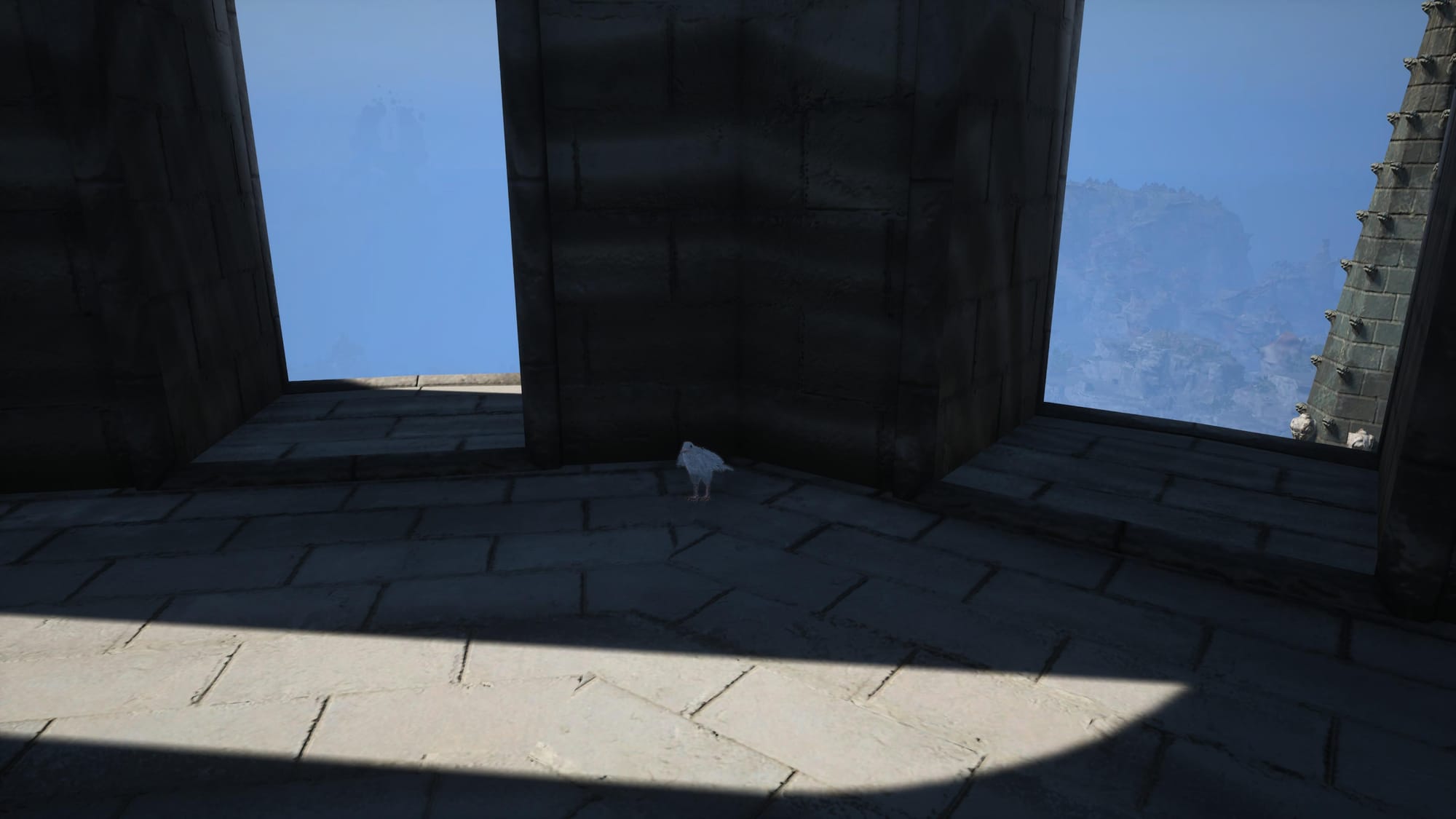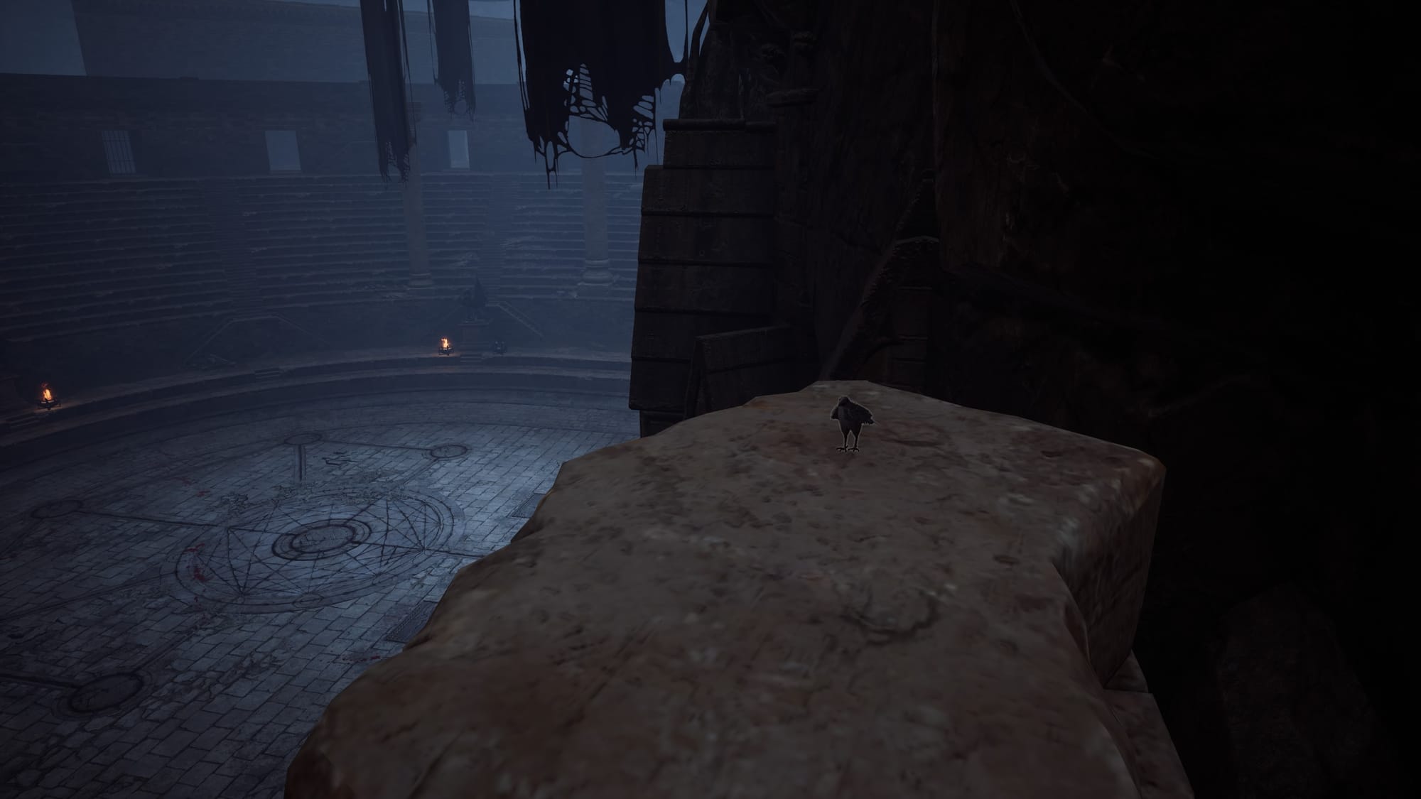Again, it’s a bit annoying to get to, but the crow is exactly where I am on the map in the picture above. You’ll need to get high enough, then jump down and fly-morph to reach it, since it’s sitting on a ledge and, from what I could tell, there aren’t any pitons or other ways to climb up to it. This is the ledge it’s perched on. It’s on the back side of the auditorium, on the right, if you’re facing it straight on.