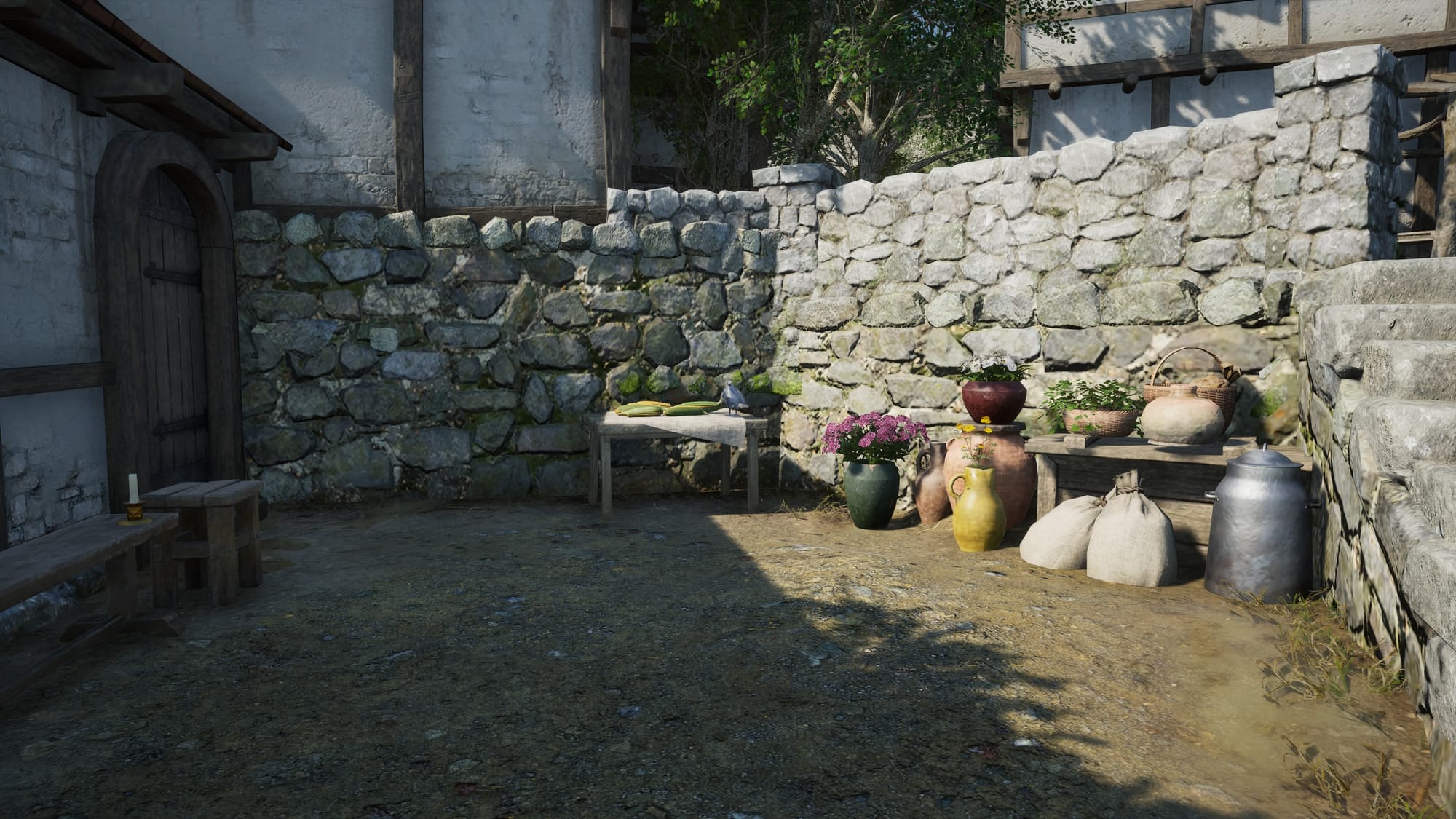 It is somewhat hidden, but it is down a set of stairs behind one of the buildings next to a bunch of corn.