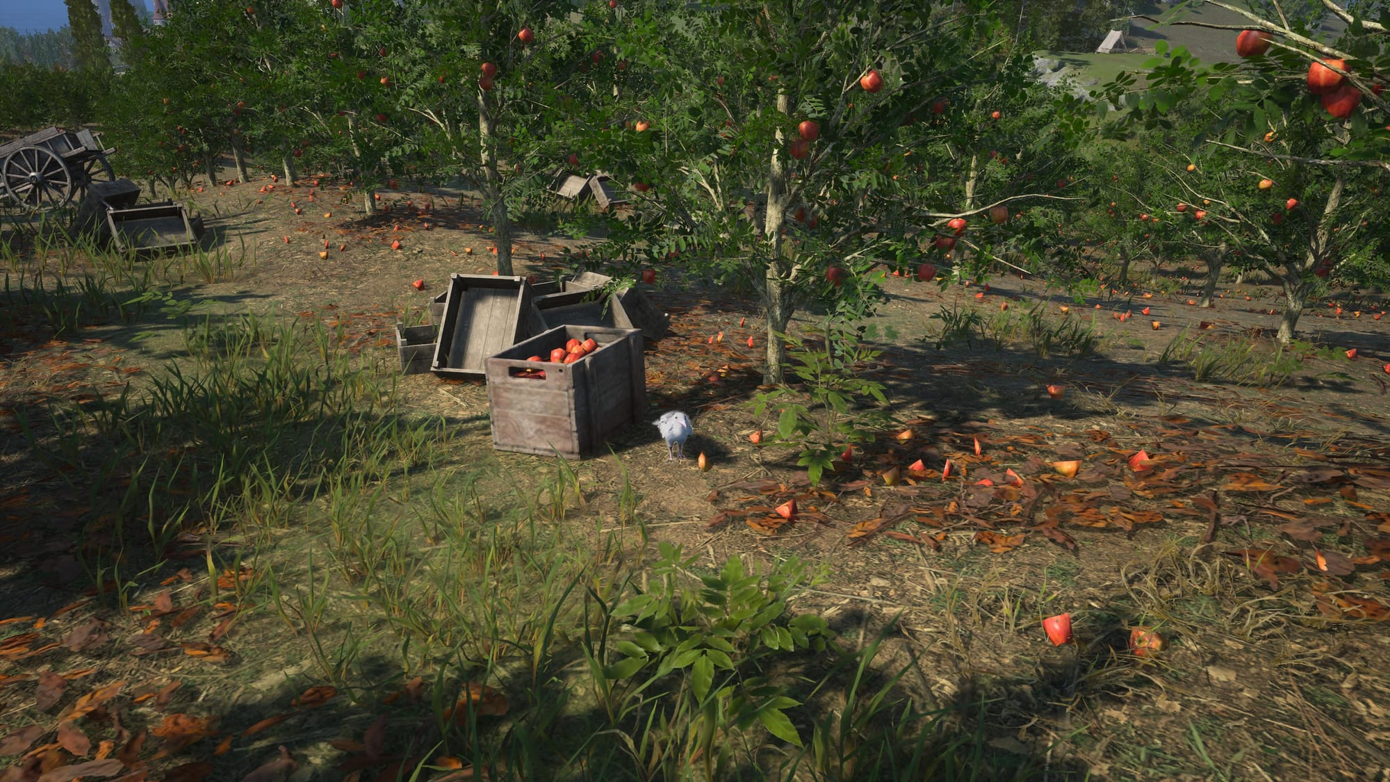 The crow is nestled in the apple orchard.