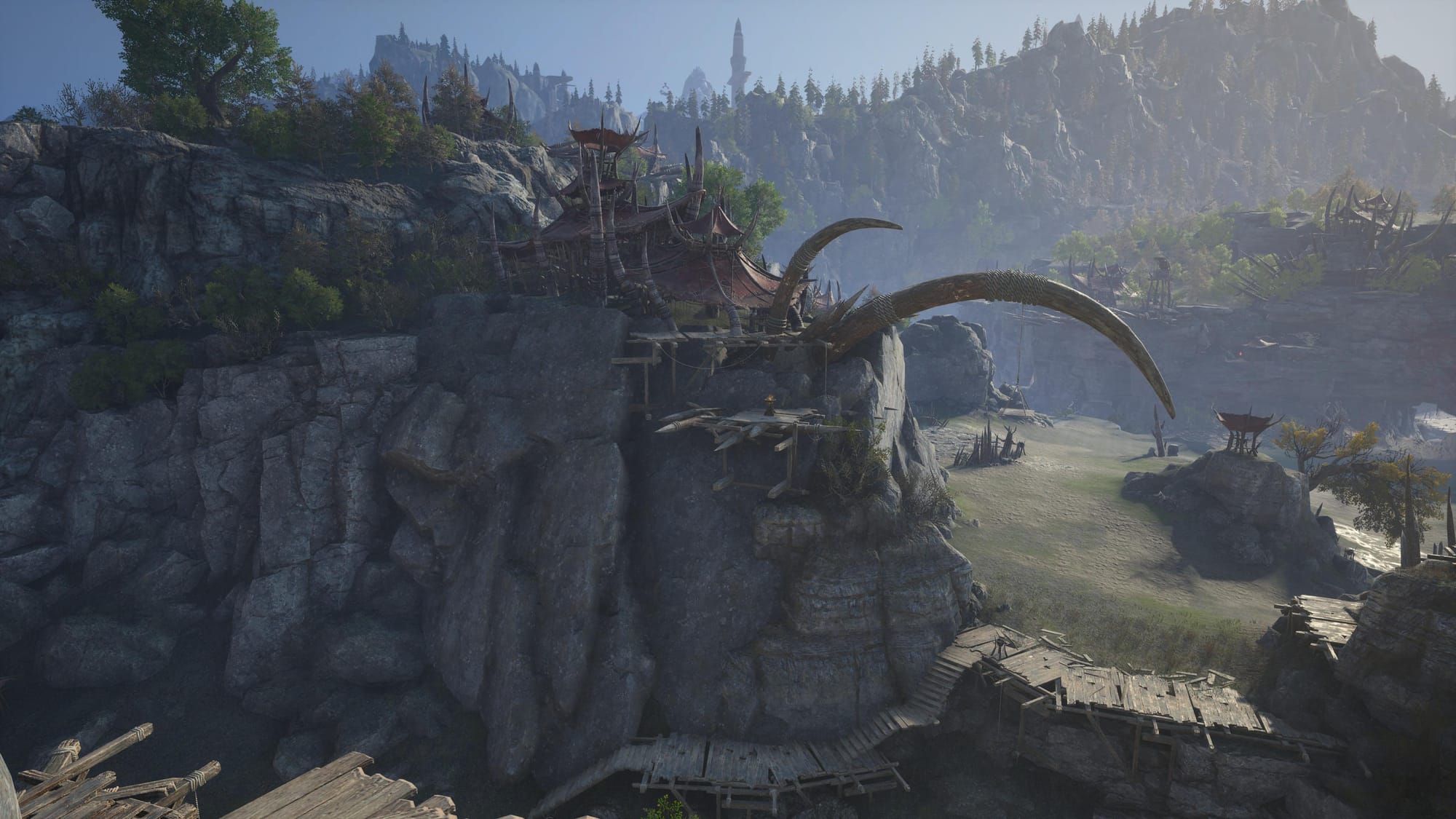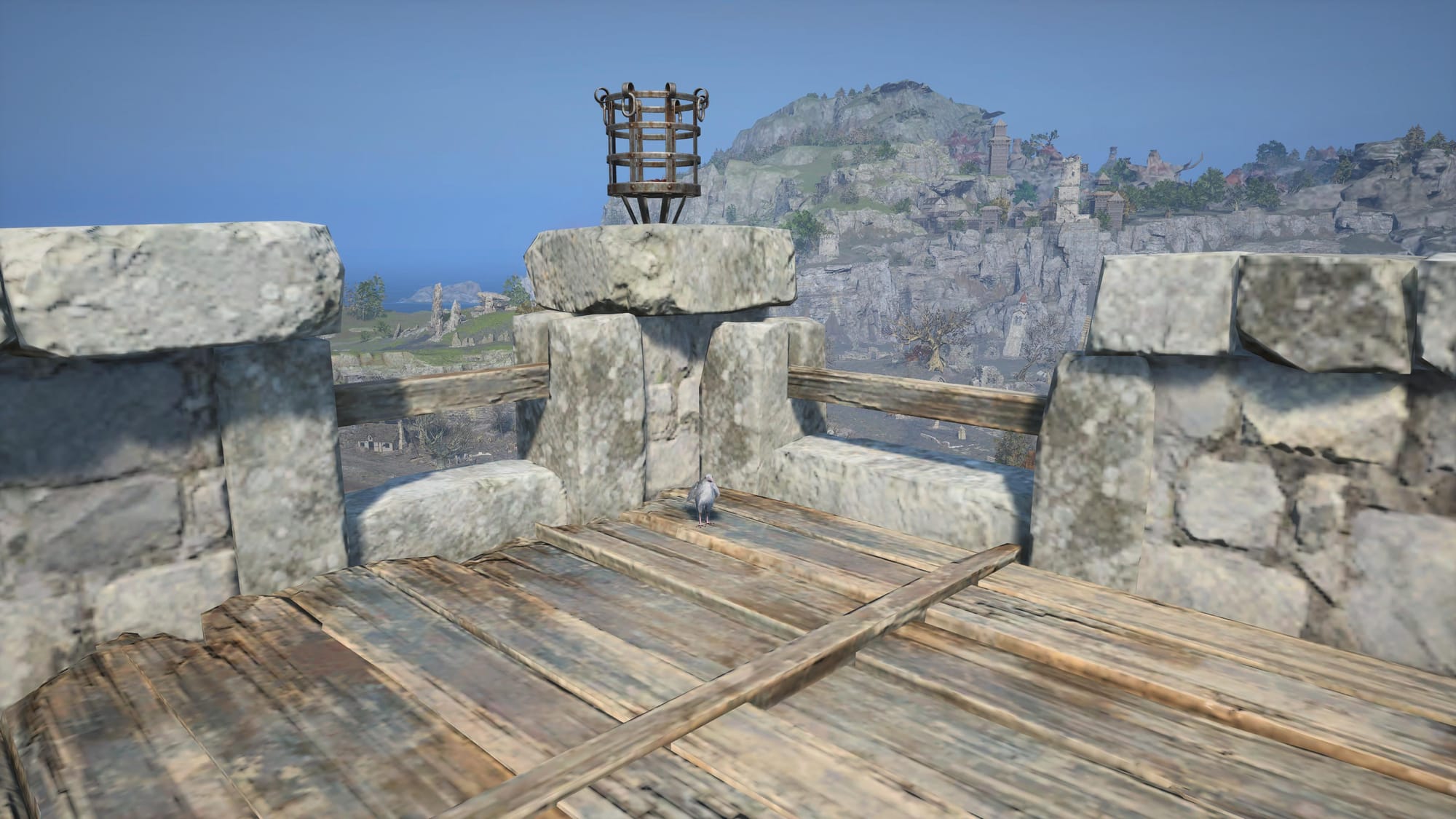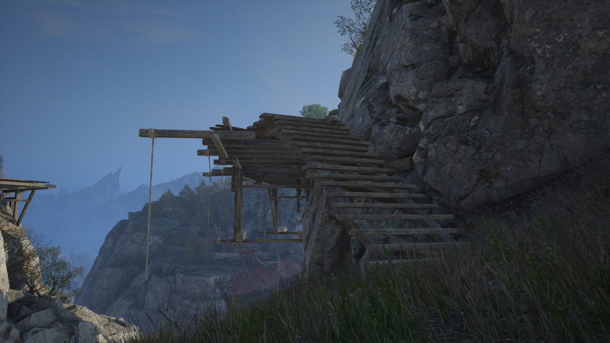Travel as high as the stairs will take you, then turn around to see a structure in the distance. You will be flying toward the bottom wooden platform hanging off the edge of the cliff. This part may be a bit tricky, I had to fly up once and use all of my stamina to make it. The image below shows what you should be looking for.
