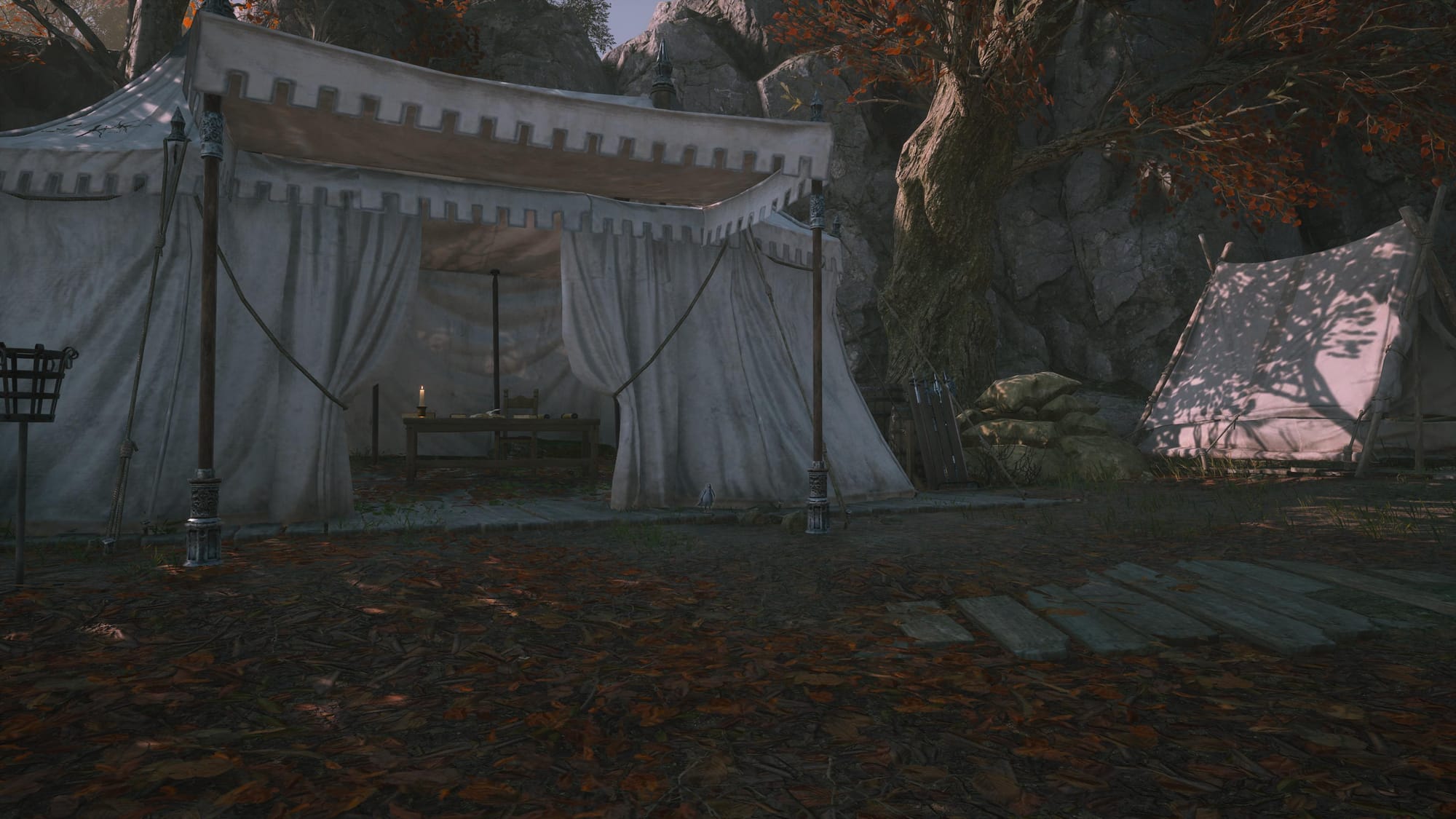 The crow is next to the largest tent in the camp.