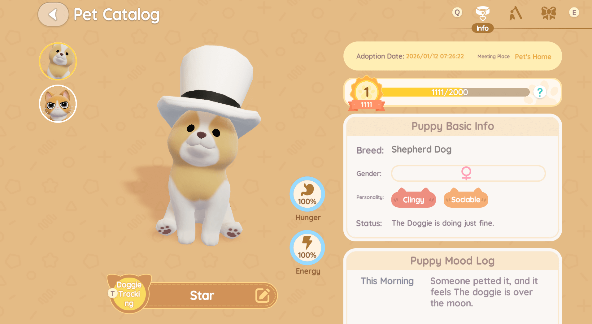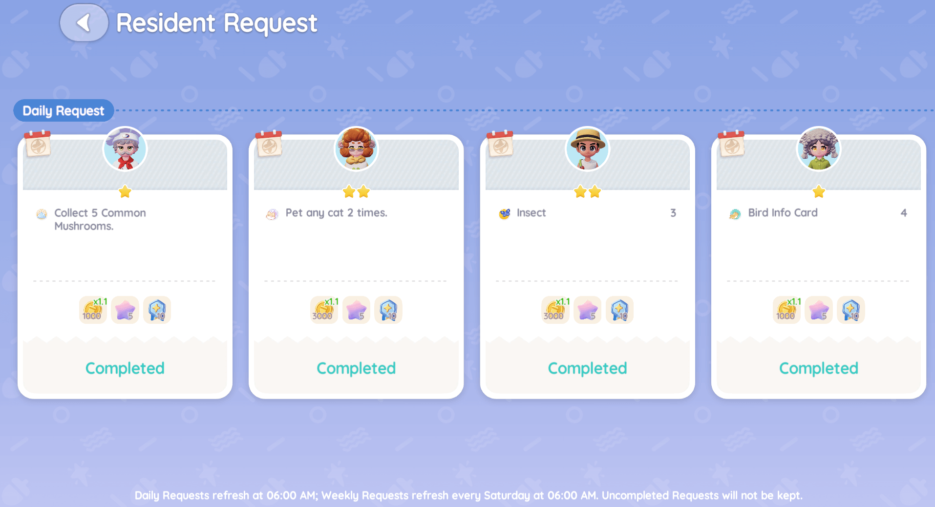 After that, I take some time to care for my dog and cat. This includes feeding them and giving them some pets. You can do this multiple times a day, but if you’re only able to log in once, make sure you don’t skip it. Caring for your pets helps level up your Dog Caring and Cat Caring hobbies, as well as your pet catalog. As you level these up, you’ll unlock new pet actions and earn rewards like gold and wishing stars. These systems take some time to level up, which is perfectly fine.