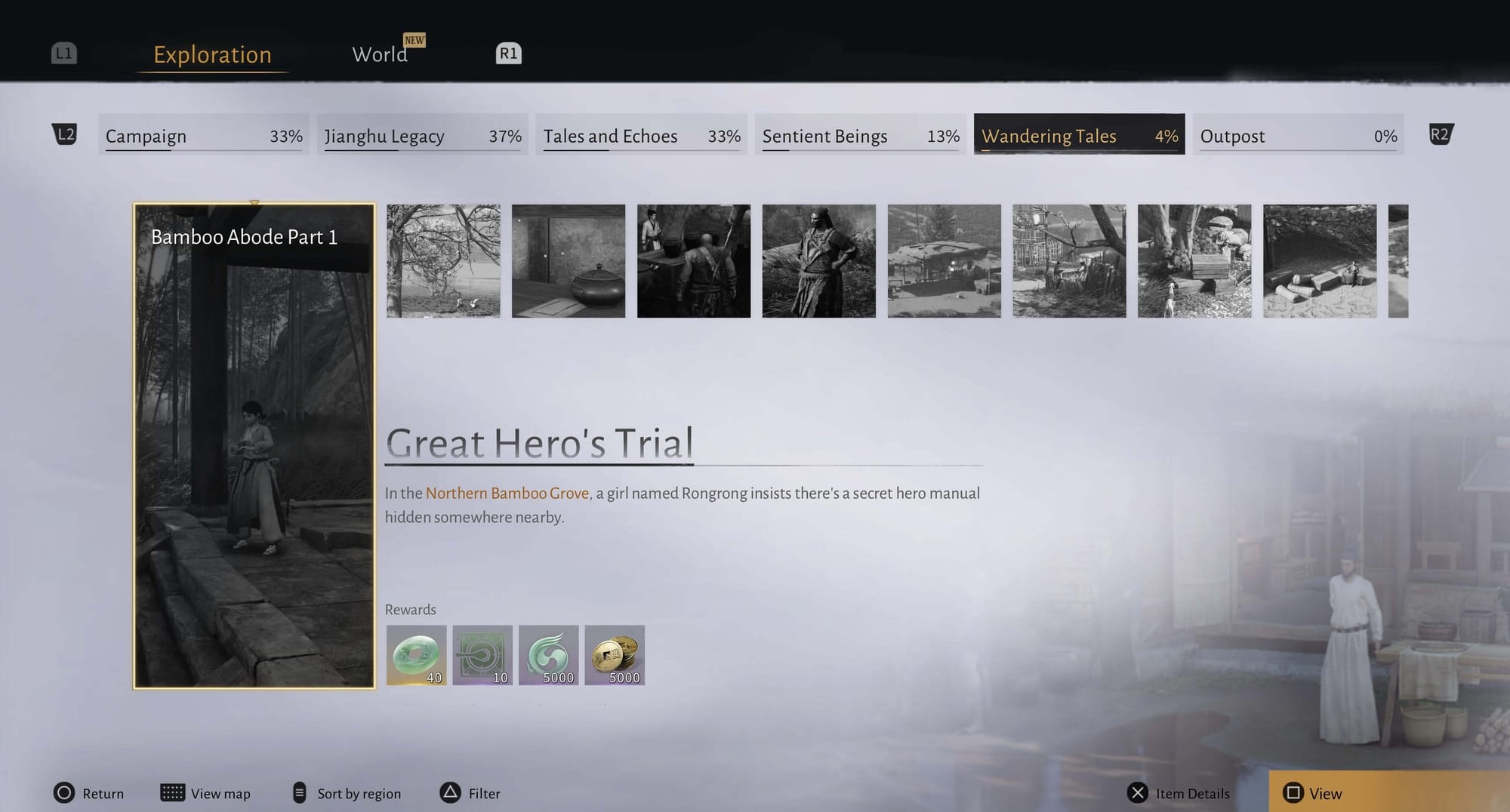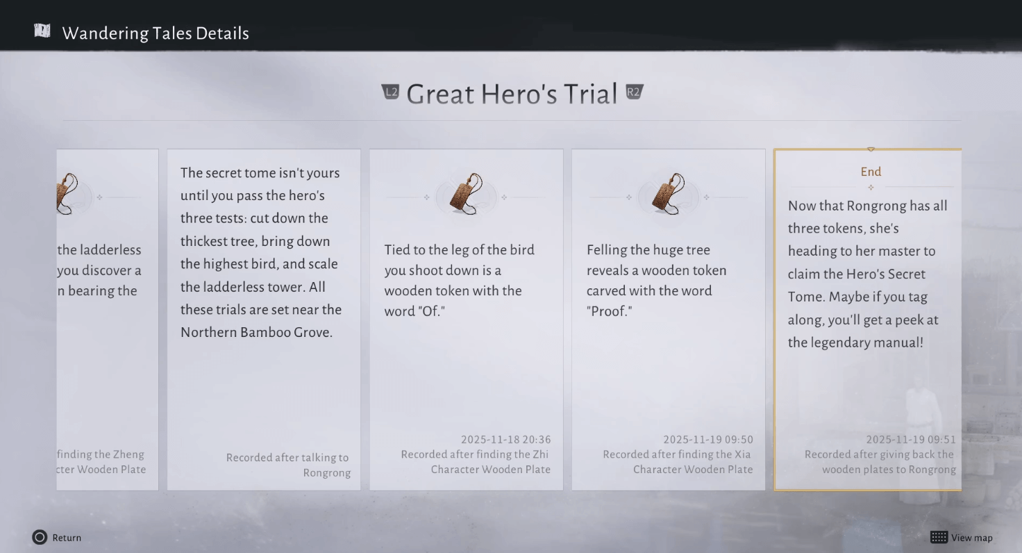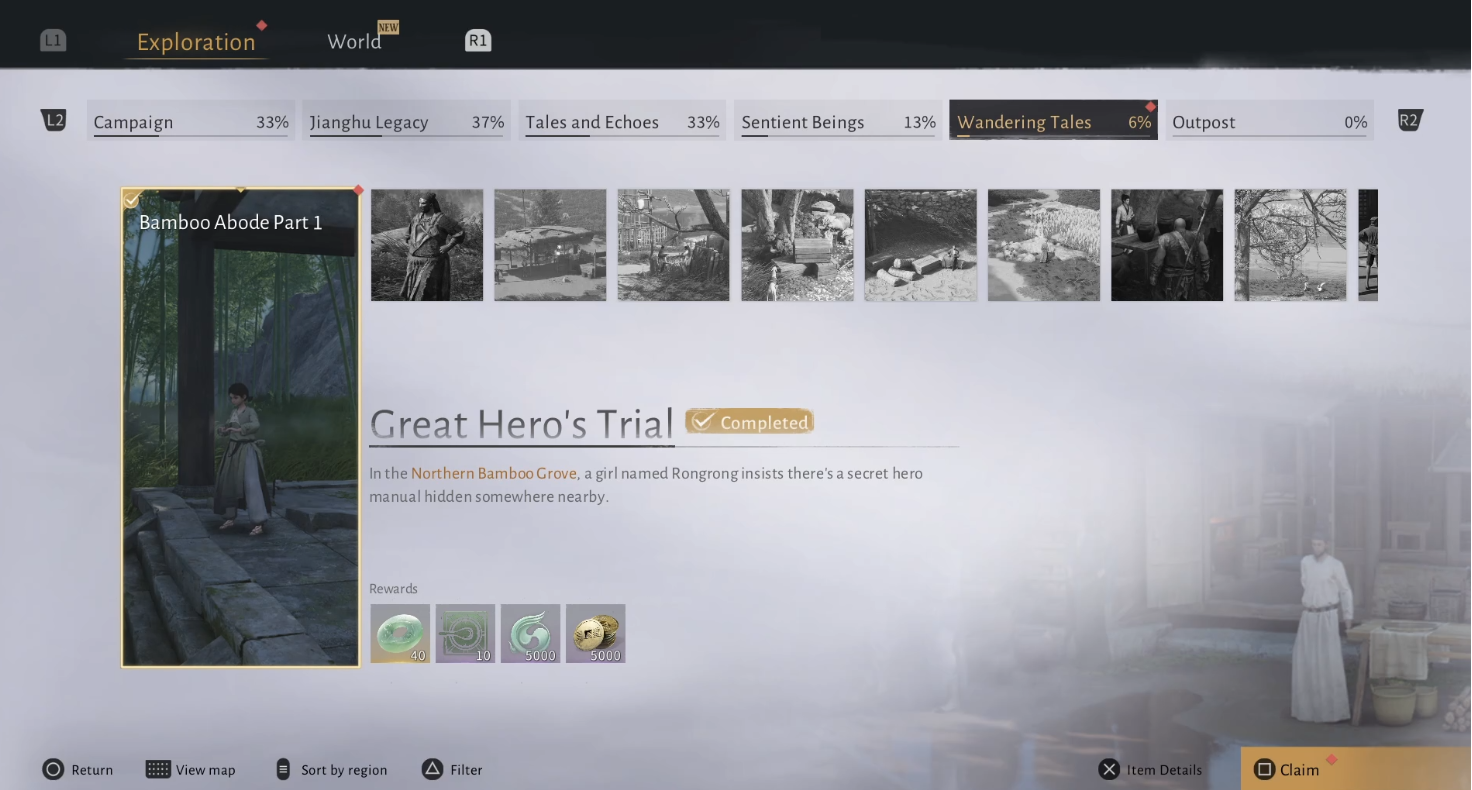 This will complete the Bamboo Abode Part 1 – Great Hero's Trial entry in your Wandering Tales tab. Make sure to go claim your rewards.