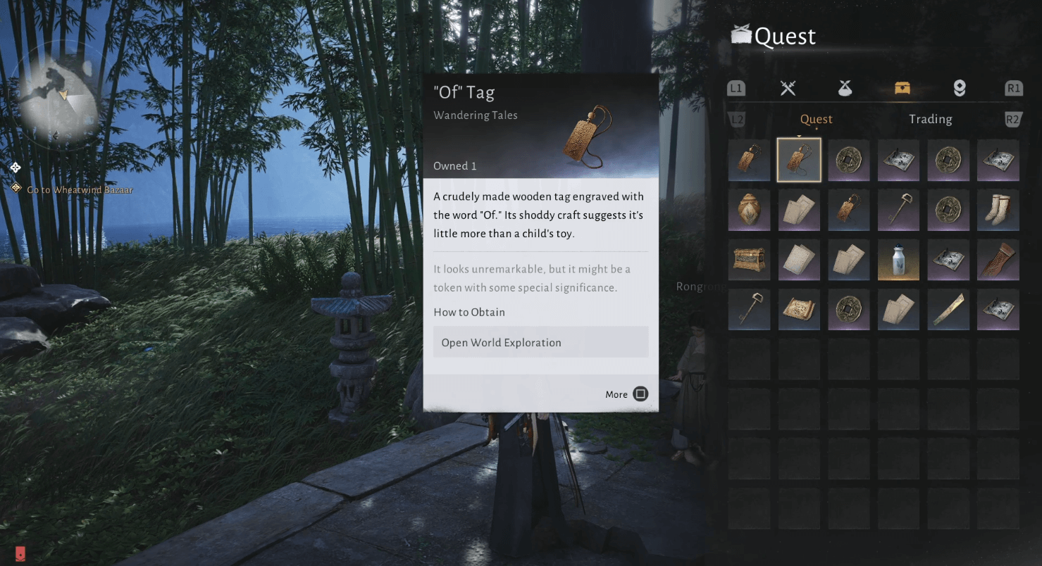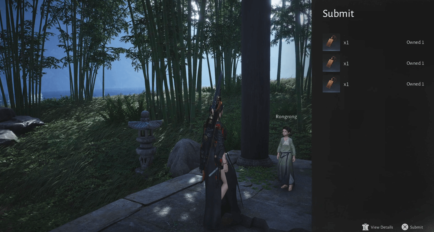 Now that you’ve collected all three tags, travel back to Rongrong. Speak with her, and a ‘Give’ option should appear.