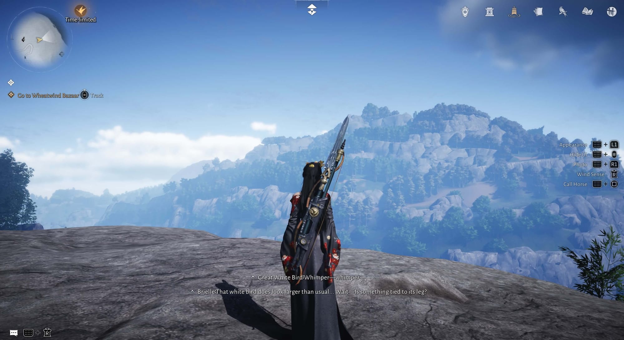 Travel up the hill behind you until you reach a large rock. As you get closer, you'll receive a dialogue prompt mentioning that the white bird above you has something tied to its leg.