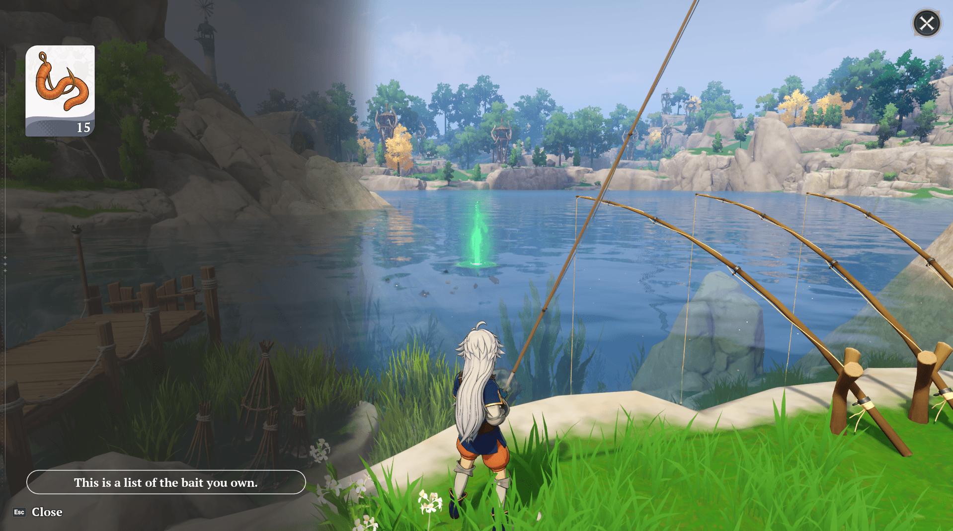 Owen will tell you that you need to make bait in order to fish. While you can fish without bait, you will have a better chance of catching something with it attached. From here, pull out your crafting workbench to get started.