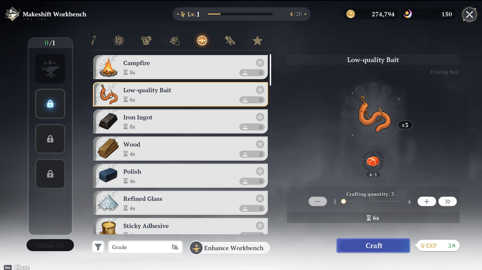Go ahead and open the crafting menu, select Low-Quality Bait, and craft a few to get started.