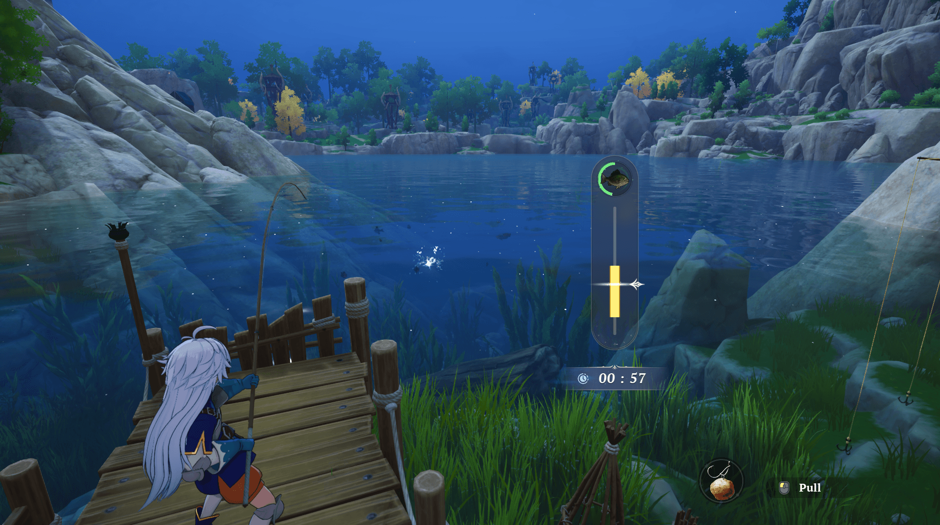 Once you get a bite, you will be introduced to the fishing mini game. Your goal here is to reel the fish in while keeping the indicator aligned within the glowing yellow section. As long as you keep it in that zone, you will maintain tension and successfully bring the fish in.