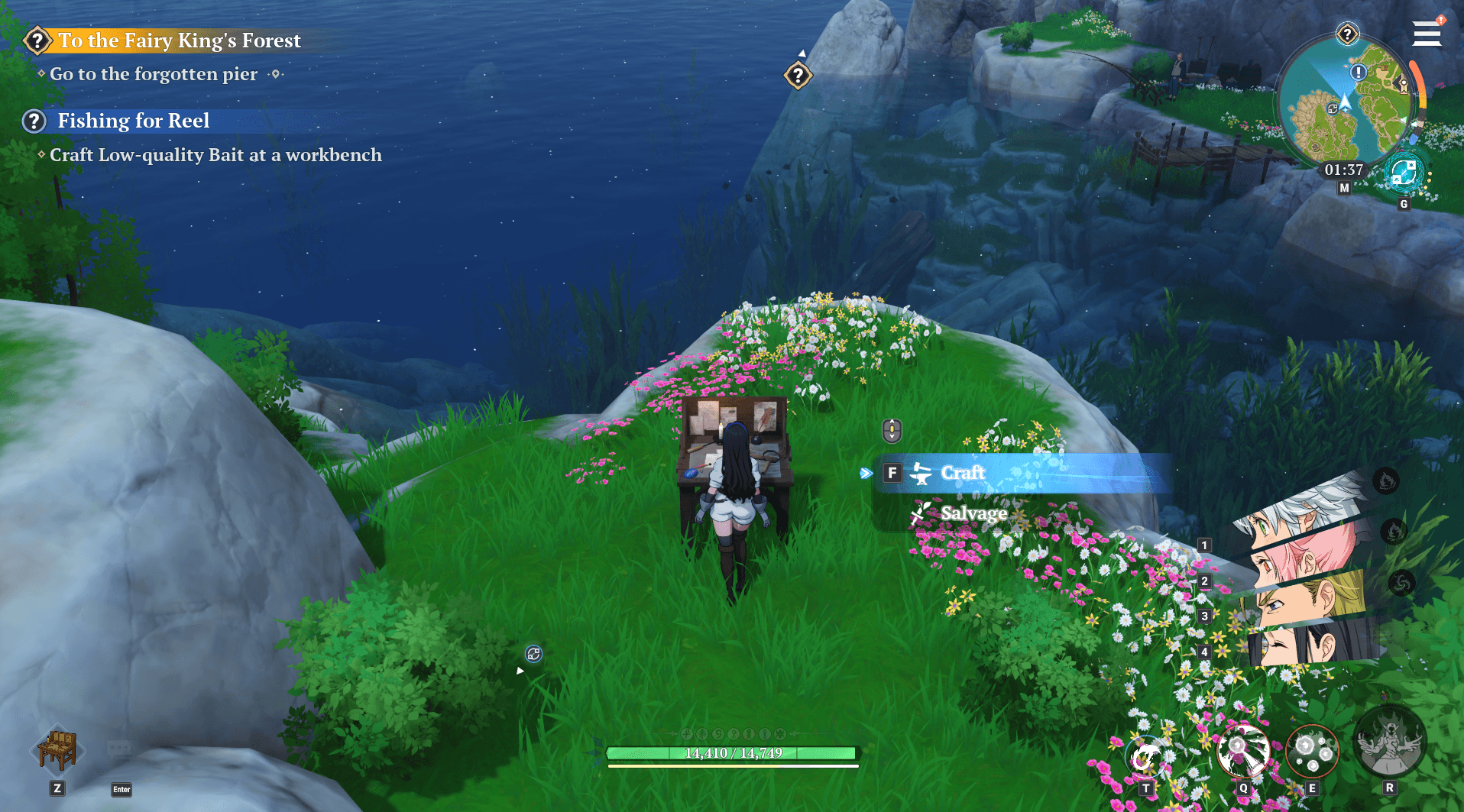 Exit out of the crafting workbench and head up to the lake. Once you are in the correct proximity, you will see a Fish option appear. Go ahead and press the button that shows on your screen.